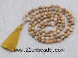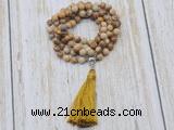 Details: Hand-knotted jasper mala necklaces: 108 8mm/10mm round picture jasper beads with 1 10*17mm alloy guru bead and satin tassel (you can choose different colors) Item: GMN607 Material: No.1: 108 8mm picture jasper beads, alloy guru bead & satin tassel No.2: 108 10mm picture jasper beads, alloy guru bead & satin tassel Color: See image Length (inch): Necklace length: No.1(8mm: approx 38 - 41 inches (Not including guru bead & tassel) No.2(10mm: approx 47 - 50 inches (Not including guru bead & tassel) Tassel Lenght: 7cm Quantity Discount Pricing: 1 – 4: None 5 – 49: 95% 50 – 99: 90% 100+: 85% This mala is available in both 8mm and 10mm beads, The listed price is for 1 piece 8mm mala necklace Each necklaces is handmade and hand-knotted with different gemstones. Please be aware that each necklace varies in stone pattern and color - Making it a truly one-of-a-kind, unique piece of jewelry. Custom orders are available upon request! If you see different stones you like/want incorporated into a mala necklace or you have any need, please contact us before you placing order or leave remark, and we will be happy to create a mala just for you! Mala necklace is worn on the neck or wrist while not in use. It may also serve as a nice accessory in everyday life or on some special occasions. Whether as a calming meditation guide or a beautiful, this necklace will be a great addition to your spiritual practice.