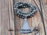 Details: Hand-knotted jasper mala necklaces: 108 8mm/10mm round grey picture jasper beads with 1 5*13mm alloy bead and satin tassel (you can choose different colors) Item: GMN608 Material: No.1: 108 8mm grey picture jasper beads, alloy bead & satin tassel No.2: 108 10mm grey picture jasper beads, alloy bead & satin tassel Color: See image Length (inch): Necklace length: No.1(8mm: approx 38 - 41 inches (Not including guru bead & tassel) No.2(10mm: approx 47 - 50 inches (Not including guru bead & tassel) Tassel Lenght: 7cm Quantity Discount Pricing: 1 – 4: None 5 – 49: 95% 50 – 99: 90% 100+: 85% This mala is available in both 8mm and 10mm beads, The listed price is for 1 piece 8mm mala necklace Each necklaces is handmade and hand-knotted with different gemstones. Please be aware that each necklace varies in stone pattern and color - Making it a truly one-of-a-kind, unique piece of jewelry. Custom orders are available upon request! If you see different stones you like/want incorporated into a mala necklace or you have any need, please contact us before you placing order or leave remark, and we will be happy to create a mala just for you! Mala necklace is worn on the neck or wrist while not in use. It may also serve as a nice accessory in everyday life or on some special occasions. Whether as a calming meditation guide or a beautiful, this necklace will be a great addition to your spiritual practice.