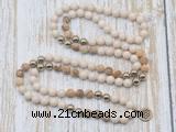 Details: Hand-knotted jasper mala necklaces: 108 8mm/10mm round matte white fossil jasper, matte picture jasper & plated hematite beads with alloy charm (you can choose different charm) Item: GMN6145 Material: No.1(8mm: white fossil jasper, matte picture jasper, plated hematite beads& charm No.2(10mm: white fossil jasper, matte picture jasper, plated hematite beads& charm Color: See image Length (inch): Necklace length: 8mm: approx 37 - 40 inches (Not including charm) 10mm: approx 46 - 50 inches (Not including charm) Quantity Discount Pricing: 1 – 4: None 5 – 49: 95% 50 – 99: 90% 100+: 85% This mala is available in both 8mm and 10mm beads, The listed price is for 1 piece 8mm mala necklace Each necklaces is handmade and hand-knotted with different gemstones. Please be aware that each necklace varies in stone pattern and color - Making it a truly one-of-a-kind, unique piece of jewelry. Custom orders are available upon request! If you see different stones you like/want incorporated into a mala necklace or you have any need, please contact us before you placing order or leave remark, and we will be happy to create a mala just for you! Mala necklace is worn on the neck or wrist while not in use. It may also serve as a nice accessory in everyday life or on some special occasions. Whether as a calming meditation guide or a beautiful, this necklace will be a great addition to your spiritual practice.
