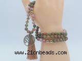Details: Hand-knotted jasper mala necklaces: 108 8mm/10mm round matte unakite, matte pink wooden jasper & plated hematite beads with tassel/tassel & alloy charm (you can choose different tassel & charm) Item: GMN6248 Material: No.1: 8mm/10mm matte unakite, matte pink wooden jasper, plated hematite beads And tassel No.2: 8mm/10mm matte unakite, matte pink wooden jasper, plated hematite beads And tassel & charm Color: See image Length (inch): Necklace length: 8mm: approx 37 - 40 inches (Not including tassel) 10mm: approx 46 - 50 inches (Not including tassel) Quantity Discount Pricing: 1 – 4: None 5 – 49: 95% 50 – 99: 90% 100+: 85% This mala is available in both 8mm and 10mm beads, The listed price is for 1 piece 8mm mala necklace Each necklaces is handmade and hand-knotted with different gemstones. Please be aware that each necklace varies in stone pattern and color - Making it a truly one-of-a-kind, unique piece of jewelry. Custom orders are available upon request! If you see different stones you like/want incorporated into a mala necklace or you have any need, please contact us before you placing order or leave remark, and we will be happy to create a mala just for you! Mala necklace is worn on the neck or wrist while not in use. It may also serve as a nice accessory in everyday life or on some special occasions. Whether as a calming meditation guide or a beautiful, this necklace will be a great addition to your spiritual practice.
