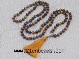 Details: Hand-knotted tiger eye mala necklaces: 108 8mm/10mm round colorfull tiger eye beads with 1 10*17mm alloy guru bead and satin tassel (you can choose different colors) Item: GMN630 Material: No.1: 108 8mm colorfull tiger eye beads, alloy guru bead & satin tassel No.2: 108 10mm colorfull tiger eye beads, alloy guru bead & satin tassel Color: See image Length (inch): Necklace length: No.1(8mm: approx 38 - 41 inches (Not including guru bead & tassel) No.2(10mm: approx 47 - 50 inches (Not including guru bead & tassel) Tassel Lenght: 7cm Quantity Discount Pricing: 1 – 4: None 5 – 49: 95% 50 – 99: 90% 100+: 85% This mala is available in both 8mm and 10mm beads, The listed price is for 1 piece 8mm mala necklace Each necklaces is handmade and hand-knotted with different gemstones. Please be aware that each necklace varies in stone pattern and color - Making it a truly one-of-a-kind, unique piece of jewelry. Custom orders are available upon request! If you see different stones you like/want incorporated into a mala necklace or you have any need, please contact us before you placing order or leave remark, and we will be happy to create a mala just for you! Mala necklace is worn on the neck or wrist while not in use. It may also serve as a nice accessory in everyday life or on some special occasions. Whether as a calming meditation guide or a beautiful, this necklace will be a great addition to your spiritual practice.