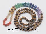 Details: Hand-knotted 7 Chakra mala necklaces: 108 8mm/10mm round grade A yellow tiger eye & 7 chakra gemstone beaded necklaces Item: GMN6424 Material: No.1(8mm: yellow tiger eye & 7 chakra beads No.2(10mm: yellow tiger eye & 7 chakra beads Color: See image Length (inch): Necklace length: 8mm: approx 37 - 40 inches 10mm: approx 46 - 50 inches Quantity Discount Pricing: 1 – 4: None 5 – 49: 95% 50 – 99: 90% 100+: 85% This mala is available in both 8mm and 10mm beads, The listed price is for 1 piece 8mm mala necklace Each necklaces is handmade and hand-knotted with different gemstones. Please be aware that each necklace varies in stone pattern and color - Making it a truly one-of-a-kind, unique piece of jewelry. Custom orders are available upon request! If you see different stones you like/want incorporated into a mala necklace or you have any need, please contact us before you placing order or leave remark, and we will be happy to create a mala just for you! Mala necklace is worn on the neck or wrist while not in use. It may also serve as a nice accessory in everyday life or on some special occasions. Whether as a calming meditation guide or a beautiful, this necklace will be a great addition to your spiritual practice.