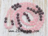 Details: Hand-knotted quartz mala necklaces: 108 8mm/10mm round rose quartz, garnet gemstone beaded necklaces Item: GMN6452 Material: No.1(8mm: rose quartz & garnet beads No.2(10mm: rose quartz & garnet beads Color: See image Length (inch): Necklace length: 8mm: approx 37 - 40 inches 10mm: approx 46 - 50 inches Quantity Discount Pricing: 1 – 4: None 5 – 49: 95% 50 – 99: 90% 100+: 85% This mala is available in both 8mm and 10mm beads, The listed price is for 1 piece 8mm mala necklace Each necklaces is handmade and hand-knotted with different gemstones. Please be aware that each necklace varies in stone pattern and color - Making it a truly one-of-a-kind, unique piece of jewelry. Custom orders are available upon request! If you see different stones you like/want incorporated into a mala necklace or you have any need, please contact us before you placing order or leave remark, and we will be happy to create a mala just for you! Mala necklace is worn on the neck or wrist while not in use. It may also serve as a nice accessory in everyday life or on some special occasions. Whether as a calming meditation guide or a beautiful, this necklace will be a great addition to your spiritual practice.
