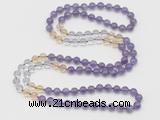 Details: Hand-knotted quartz mala necklaces: 108 8mm/10mm round amethyst, citrine & white crystal gemstone beaded necklaces Item: GMN6453 Material: No.1(8mm: amethyst, citrine & white crystal beads No.2(10mm: amethyst, citrine & white crystal beads Color: See image Length (inch): Necklace length: 8mm: approx 37 - 40 inches 10mm: approx 46 - 50 inches Quantity Discount Pricing: 1 – 4: None 5 – 49: 95% 50 – 99: 90% 100+: 85% This mala is available in both 8mm and 10mm beads, The listed price is for 1 piece 8mm mala necklace Each necklaces is handmade and hand-knotted with different gemstones. Please be aware that each necklace varies in stone pattern and color - Making it a truly one-of-a-kind, unique piece of jewelry. Custom orders are available upon request! If you see different stones you like/want incorporated into a mala necklace or you have any need, please contact us before you placing order or leave remark, and we will be happy to create a mala just for you! Mala necklace is worn on the neck or wrist while not in use. It may also serve as a nice accessory in everyday life or on some special occasions. Whether as a calming meditation guide or a beautiful, this necklace will be a great addition to your spiritual practice.