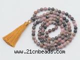 Details: Hand-knotted rhodonite mala necklaces: 108 8mm/10mm round rhodonite beads with 1 12mm guru bead & satin tassel (you can choose different tassels) Item: GMN795 Material: No.1(8mm: 108 8mm rhodonite, 12mm guru bead & satin tassel No.2(10mm: 108 10mm rhodonite, 12mm guru bead & satin tassel Color: See image Length (inch): Necklace length: No.1(8mm: approx 37 - 40 inches (Not including guru bead & tassel) No.2(10mm: approx 46 - 50 inches (Not including guru bead & tassel) Tassel Lenght: 7cm Quantity Discount Pricing: 1 – 4: None 5 – 49: 95% 50 – 99: 90% 100+: 85% This mala is available in both 8mm and 10mm beads, The listed price is for 1 piece 8mm mala necklace Each necklaces is handmade and hand-knotted with different gemstones. Please be aware that each necklace varies in stone pattern and color - Making it a truly one-of-a-kind, unique piece of jewelry. Custom orders are available upon request! If you see different stones you like/want incorporated into a mala necklace or you have any need, please contact us before you placing order or leave remark, and we will be happy to create a mala just for you! Mala necklace is worn on the neck or wrist while not in use. It may also serve as a nice accessory in everyday life or on some special occasions. Whether as a calming meditation guide or a beautiful, this necklace will be a great addition to your spiritual practice.