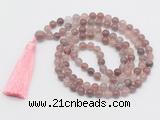 Details: Hand-knotted quartz mala necklaces: 108 8mm/10mm round purple strawberry quartz gemstone beads with 1 12mm guru bead and satin tassel (you can choose different tassels) Item: GMN812 Material: No.1(8mm: 108 8mm purple strawberry quartz beads, 12mm guru bead & satin tassel No.2(10mm: 108 10mm purple strawberry quartz beads, 12mm guru bead & satin tassel Color: See image Length (inch): Necklace length: No.1(8mm: approx 37 - 40 inches (Not including guru bead & tassel) No.2(10mm: approx 46 - 50 inches (Not including guru bead & tassel) Tassel Lenght: 7cm Quantity Discount Pricing: 1 – 4: None 5 – 49: 95% 50 – 99: 90% 100+: 85% This mala is available in both 8mm and 10mm beads, The listed price is for 1 piece 8mm mala necklace Each necklaces is handmade and hand-knotted with different gemstones. Please be aware that each necklace varies in stone pattern and color - Making it a truly one-of-a-kind, unique piece of jewelry. Custom orders are available upon request! If you see different stones you like/want incorporated into a mala necklace or you have any need, please contact us before you placing order or leave remark, and we will be happy to create a mala just for you! Mala necklace is worn on the neck or wrist while not in use. It may also serve as a nice accessory in everyday life or on some special occasions. Whether as a calming meditation guide or a beautiful, this necklace will be a great addition to your spiritual practice.