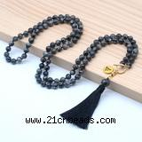 Details: Hand-knotted gemstone mala necklaces: 8mm round black labradorite gemstone beaded necklace finished with OT clasp, alloy charm, lobster clasp, 12mm black labradorite guru bead & satin tassel (Style No.4) (You can choose different style) Item: GMN8220 Material: 8mm black labradorite, 12mm black labradorite guru bead, OT clasp, lobster clasp, tassel, charm & No.72 jade thread (Different styles, different materials) Color/Number: No.1: 18” 8mm necklace, No.2: 20” 8mm necklace No.3: 22” 8mm necklace, No.4: 24” 8mm necklace No.5: 26” 8mm necklace, No.6: 28” 8mm necklace No.7: 30” 8mm necklace, No.8: 32” 8mm necklace No.9: 34” 8mm necklace, No.10: 36” 8mm necklace No.11: 54 8mm beads necklace, No.12: 108 8mm beads necklace Style: No.1: black labradorite beads mala necklace No.2: No.1 with charm No.3: No.1 with 12mm black labradorite guru bead & tassel No.4: No.1 with 12mm black labradorite guru bead, tassel & charm (You can choose different OT clasp/chram/tassel; we will use the lobster clasp same as the color of OT clasp) Length (inch): Approx 18 inches (Default) You can choose 20”; 22”; 24”; 26”; 28”; 30”; 32”; 34”; 36”; 54 beads or 108 beads necklaces If you like 38”; 40”; 42”; 44”; 46”; 48” or bracelet(7” or 8”), please contact us before you placing order (Not including guru bead & tassel) Quantity Discount Pricing: 1 – 4: None 5 – 49: 95% 50 – 99: 90% 100+: 85% This necklace is available in 8mm, The listed price is for 1 piece 18” 8mm necklace Style No.1 Custom orders are available upon request!