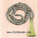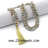 Details: Hand-knotted gemstone mala necklaces: 27/54/108 8mm/10mm round matte rhyolite beads & 12mm matte rhyolite guru bead with satin tassel Item: GMN8428 Material: 8mm/10mm matte rhyolite, 12mm matte rhyolite guru bead, tassel & No.72 jade thread [you can choose different guru bead(style) & tassel] Color/Number: No.1: 8mm 27 beads mala necklace (you can't choose style No.3) No.2: 8mm 54 beads mala necklace No.3: 8mm 108 beads mala necklace No.4: 10mm 27 beads mala necklace (you can’t choose style No.3) No.5: 10mm 54 beads mala necklace No.6: 10mm 108 beads mala necklace Style: No.1: matte rhyolite beads mala necklace No.2: matte rhyolite beads & 12mm matte rhyolite guru bead with tassel No.3: matte rhyolite beads, clasp & 12mm matte rhyolite guru bead with tassel (you can choose different clasp) No.4/No.5/No.6: matte rhyolite beads & 11mm/12mm/10mm alloy guru bead with tassel No.7/No.8/No.9/No.10: matte rhyolite beads & 12mm silver/gold/rose gold/ gunmetal zircon ball guru bead with tassel (No.2 - No.10: you can choose different tassel) Length (inch): 27 beads 8mm: approx 9 – 10 inches; 10mm: 12 – 13 inches 54 beads 8mm: approx 18 – 20 inches; 10mm: 23 – 25 inches 108 beads 8mm: approx 37 – 40 inches; 10mm: 46 – 50 inches (Not including guru bead & tassel) Quantity Discount Pricing: 1 – 4: None 5 – 49: 95% 50 – 99: 90% 100+: 85% This mala is available in both 8mm and 10mm beads, The listed price is for 8mm 27 beads mala necklace Style No.1 Custom orders are available upon request!