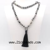 Details: Hand-knotted jasper mala necklaces: 27/54/108 8mm/10mm round matte black water jasper beads & 12mm matte black water jasper guru bead with satin tassel Item: GMN8453 Material: 8mm/10mm matte black water jasper, 12mm matte black water jasper guru bead, tassel & No.72 jade thread [you can choose different guru bead(style) & tassel] Color/Number: No.1: 8mm 27 beads mala necklace (you can't choose style No.3) No.2: 8mm 54 beads mala necklace No.3: 8mm 108 beads mala necklace No.4: 10mm 27 beads mala necklace (you can’t choose style No.3) No.5: 10mm 54 beads mala necklace No.6: 10mm 108 beads mala necklace Style: No.1: matte black water jasper beads mala necklace No.2: matte black water jasper beads & 12mm matte black water jasper guru bead with tassel No.3: matte black water jasper beads, clasp & 12mm matte black water jasper guru bead with tassel (you can choose different clasp) No.4/No.5/No.6: matte black water jasper beads & 11mm/12mm/10mm alloy guru bead with tassel No.7/No.8/No.9/No.10: matte black water jasper beads & 12mm silver/gold/rose gold/ gunmetal zircon ball guru bead with tassel (No.2 - No.10: you can choose different tassel) Length (inch): 27 beads 8mm: approx 9 – 10 inches; 10mm: 12 – 13 inches 54 beads 8mm: approx 18 – 20 inches; 10mm: 23 – 25 inches 108 beads 8mm: approx 37 – 40 inches; 10mm: 46 – 50 inches (Not including guru bead & tassel) Quantity Discount Pricing: 1 – 4: None 5 – 49: 95% 50 – 99: 90% 100+: 85% This mala is available in both 8mm and 10mm beads, The listed price is for 8mm 27 beads mala necklace Style No.1 Custom orders are available upon request!
