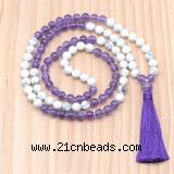 Details: Hand-knotted gemstone mala necklaces: 108 8mm/10mm round amethyst, white howlite beads & 12mm amethyst guru bead with satin tassel Item: GMN8632 Material: 8mm/10mm amethyst, white howlite beads, 12mm amethyst guru bead, tassel & No.72 jade thread [you can choose different guru bead(style) & tassel] Color/Number: No.1: 8mm 108 beads mala necklace No.2: 10mm 108 beads mala necklace Style: No.1: amethyst & white howlite 108 beads mala necklace No.2: No.1 & 12mm amethyst guru bead with tassel No.3: No.1, clasp & 12mm amethyst guru bead with tassel (you can choose different clasp) No.4/No.5/No.6: No.1 & 11mm/12mm/10mm alloy guru bead with tassel No.7/No.8/No.9/No.10: No.1 & 12mm silver/gold/rose gold/gunmetal zircon ball guru bead with tassel (No.2 - No.10: you can choose different tassel) Length (inch): 8mm: approx 37 – 40 inches 10mm: approx 46 – 50 inches (Not including guru bead & tassel) Quantity Discount Pricing: 1 – 4: None 5 – 49: 95% 50 – 99: 90% 100+: 85% This mala is available in both 8mm and 10mm beads, The listed price is for 1 piece 8mm 108 beads mala necklace Style No.1 Custom orders are available upon request!