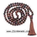 Item: GMN8723 Material: Style No.1: 8mm/10mm matte red tiger eye Style No.2: 8mm/10mm matte red tiger eye, 12mm matte red tiger eye guru bead & silk tassel Style No.3: 8mm/10mm matte red tiger eye, 12mm matte red tiger eye guru bead & 8mm/10mm matte red tiger eye beaded tassel Length (inch): 8mm: approx 37 - 40 inches 10mm: approx 46 - 50 inches (Not including guru bead & tassel) Quantity Discount Pricing: 1 – 4: None 5 – 49: 95% 50 – 99: 90% 100+: 85% This mala is available in both 8mm and 10mm beads, The listed price is for 8mm Style No.1 Necklace And the picture shows 8mm Style No.2. Each necklaces is handmade with different gemstones. Please be aware that each necklace varies in stone pattern and color - Making it a truly one-of-a-kind, unique piece of jewelry. Custom orders are available upon request! If you see different stones you like/want incorporated into a mala necklace or you have any need, please contact us before you placing order or leave remark, and we will be happy to create a mala just for you! Mala necklace is worn on the neck or wrist while not in use. It may also serve as a nice accessory in everyday life or on some special occasions. Whether as a calming meditation guide or a beautiful, this necklace will be a great addition to your spiritual practice.