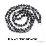 Item: GMN8825 Material: Style No.1: 8mm/10mm black banded agate Style No.2: 8mm/10mm black banded agate, 12mm black banded agate guru bead & silk tassel Style No.3: 8mm/10mm black banded agate, 12mm black banded agate guru bead & 8mm/10mm black banded agate beaded tassel Length (inch): 8mm: approx 37 - 40 inches 10mm: approx 46 - 50 inches (Not including guru bead & tassel) Quantity Discount Pricing: 1 – 4: None 5 – 49: 95% 50 – 99: 90% 100+: 85% This mala is available in both 8mm and 10mm beads, The listed price is for 8mm Style No.1 Necklace And the picture shows 8mm Style No.2. Each necklaces is handmade with different gemstones. Please be aware that each necklace varies in stone pattern and color - Making it a truly one-of-a-kind, unique piece of jewelry. Custom orders are available upon request! If you see different stones you like/want incorporated into a mala necklace or you have any need, please contact us before you placing order or leave remark, and we will be happy to create a mala just for you! Mala necklace is worn on the neck or wrist while not in use. It may also serve as a nice accessory in everyday life or on some special occasions. Whether as a calming meditation guide or a beautiful, this necklace will be a great addition to your spiritual practice.