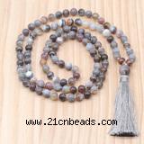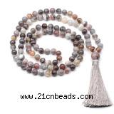 Item: GMN8833 Material: Style No.1: 8mm/10mm Botswana agate Style No.2: 8mm/10mm Botswana agate, 12mm Botswana agate guru bead & silk tassel Style No.3: 8mm/10mm Botswana agate, 12mm Botswana agate guru bead & 8mm/10mm Botswana agate beaded tassel Length (inch): 8mm: approx 37 - 40 inches 10mm: approx 46 - 50 inches (Not including guru bead & tassel) Quantity Discount Pricing: 1 – 4: None 5 – 49: 95% 50 – 99: 90% 100+: 85% This mala is available in both 8mm and 10mm beads, The listed price is for 8mm Style No.1 Necklace And the picture shows 8mm Style No.2. Each necklaces is handmade with different gemstones. Please be aware that each necklace varies in stone pattern and color - Making it a truly one-of-a-kind, unique piece of jewelry. Custom orders are available upon request! If you see different stones you like/want incorporated into a mala necklace or you have any need, please contact us before you placing order or leave remark, and we will be happy to create a mala just for you! Mala necklace is worn on the neck or wrist while not in use. It may also serve as a nice accessory in everyday life or on some special occasions. Whether as a calming meditation guide or a beautiful, this necklace will be a great addition to your spiritual practice.
